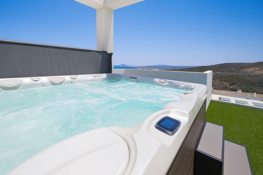 Superbe terrasse en solarium aménagée avec jacuzzi.