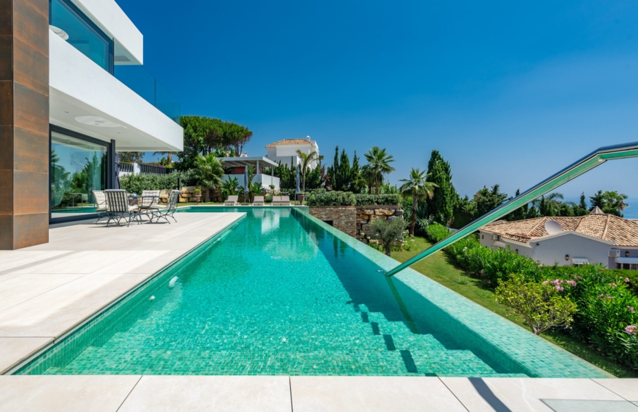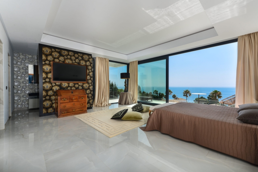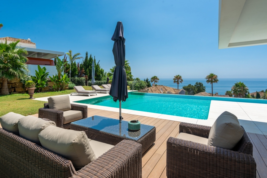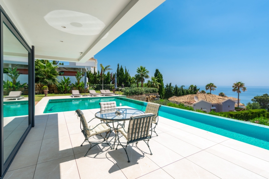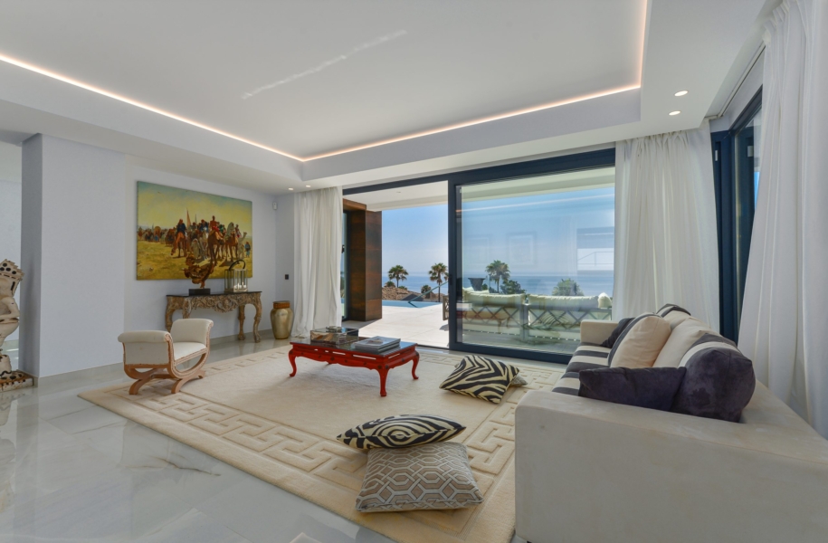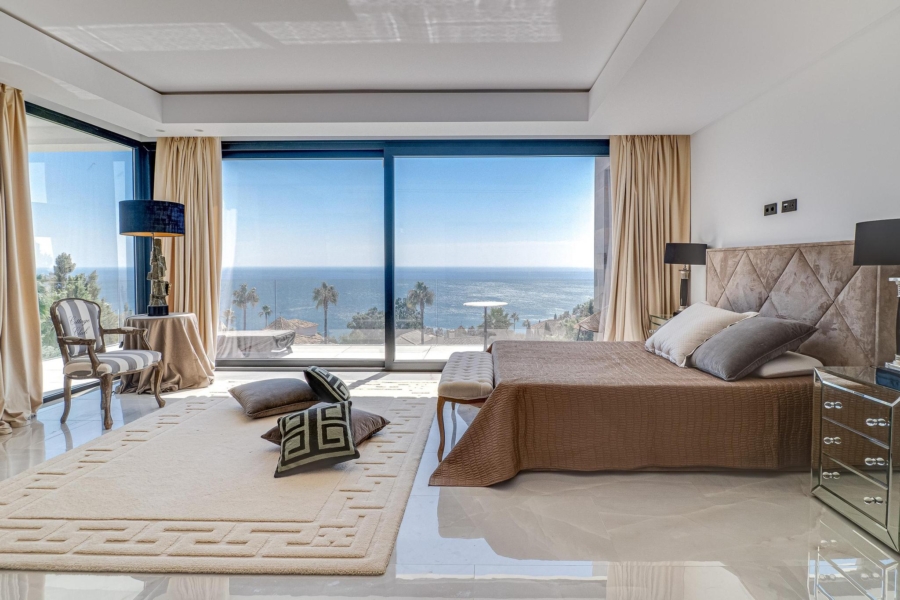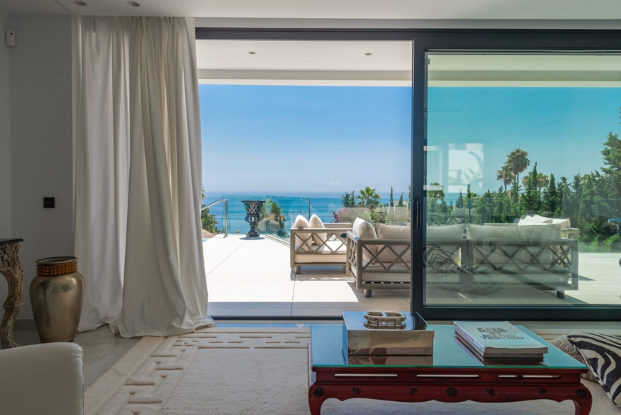 Vue panoramique : Chaque pièce de cette villa offre une vue imprenable sur la mer Méditerranée jusqu’aux côtes de l’Afrique du Nord.