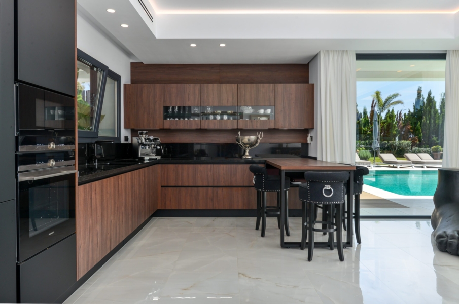 Espaces de vie extérieurs : Profitez des jardins paysagers, d’une terrasse de 150 m² et d’une cuisine extérieure équipée sous une pergola bio-climatique.
