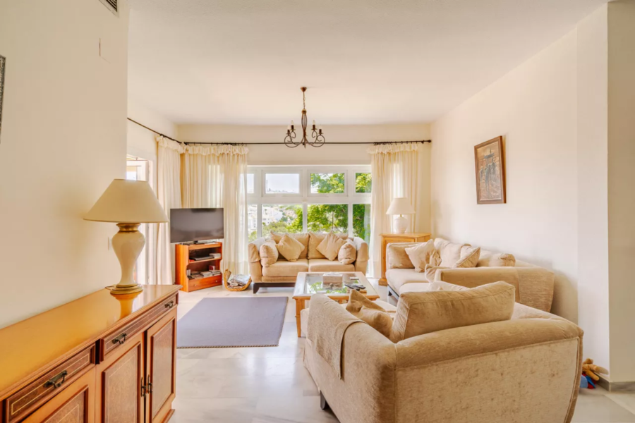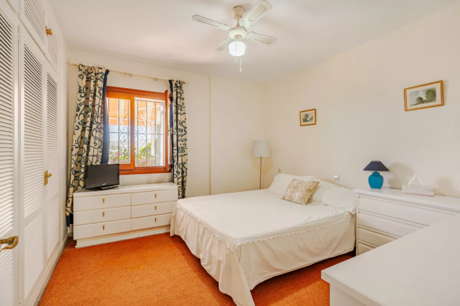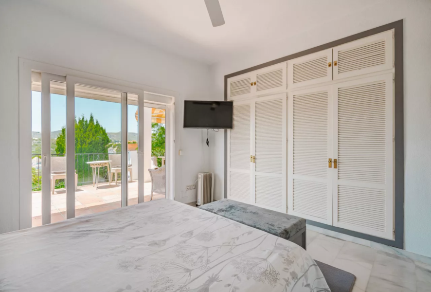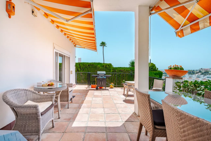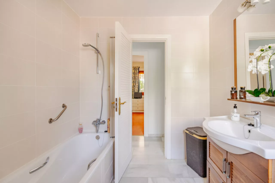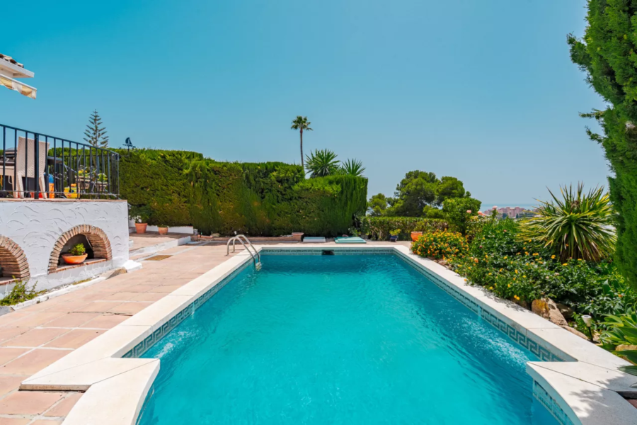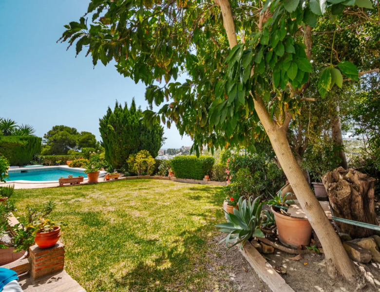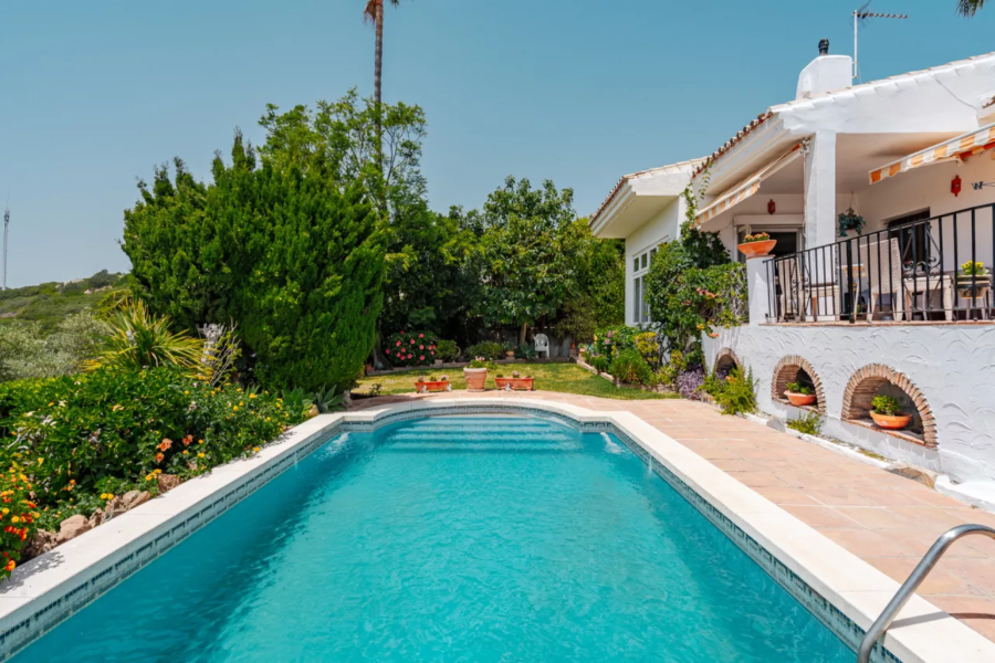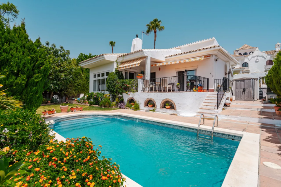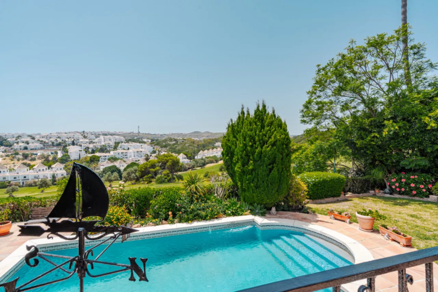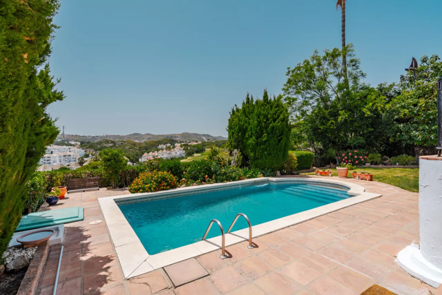 Villa de caractère de 3ch et 2 salles de bains, piscine privée, jardin, terrasse et vue sur golf et mer.