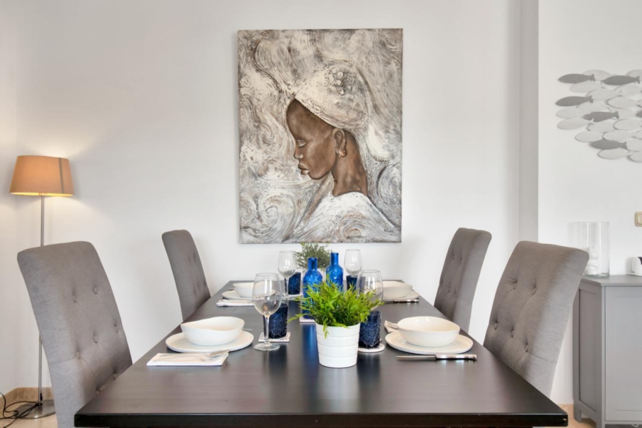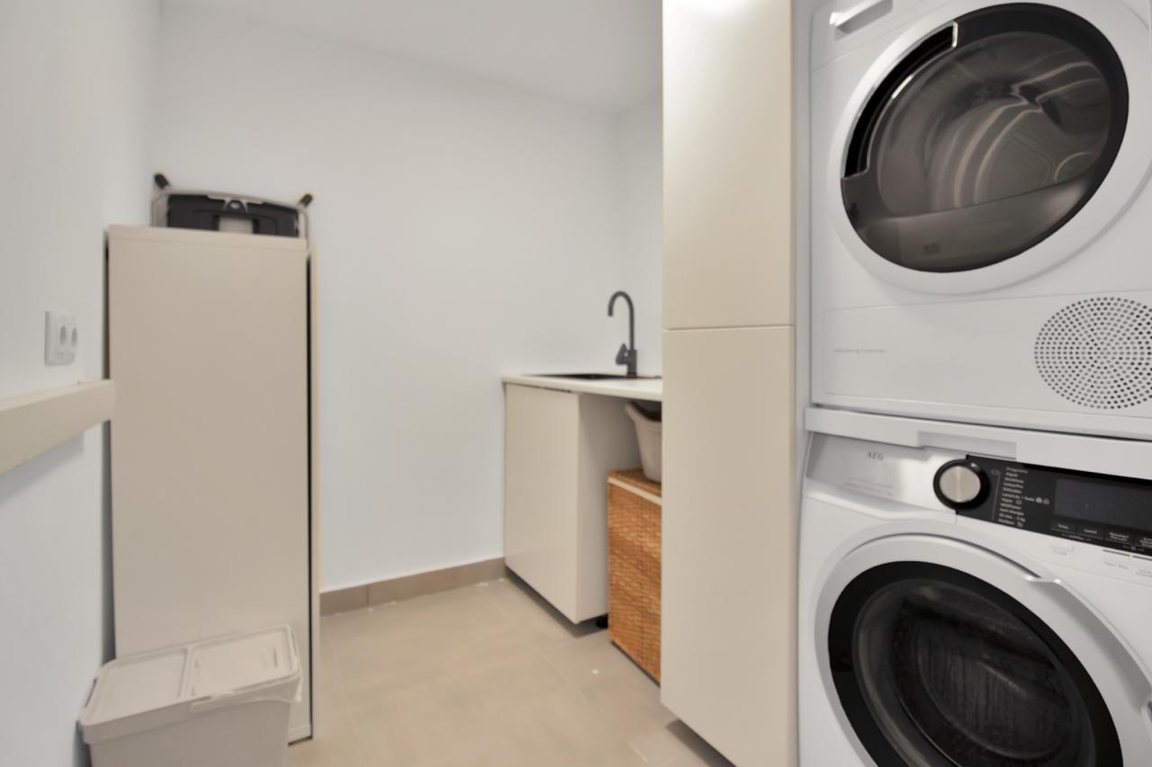 Le rez-de-chaussée, de 60m2, dispose d’une cuisine équipée ouverte sur le salon et la salle à manger. Accès direct à la terrasse avec jardin de 123m2 et piscine privée (5,5m x 3,5m).